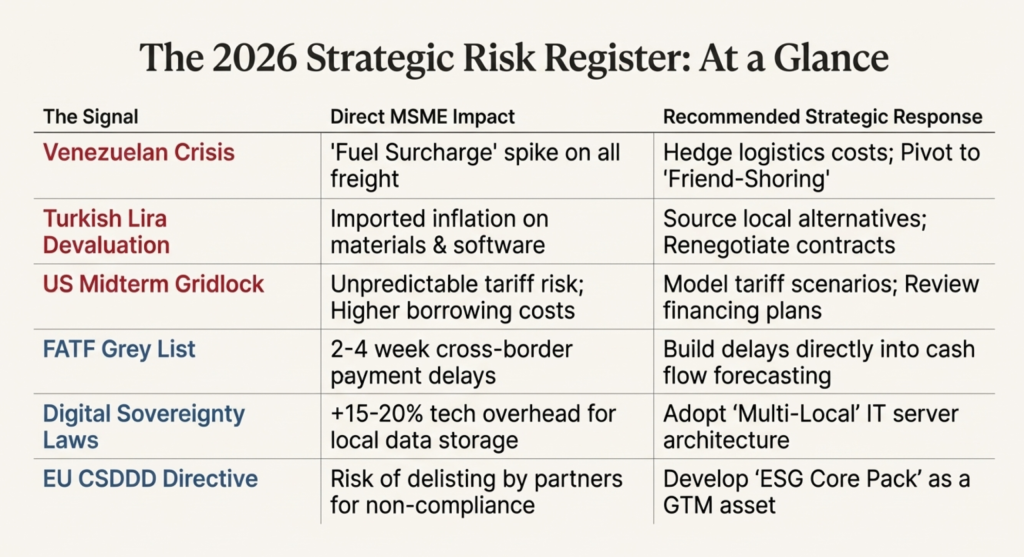 The capture of President Maduro by US forces in January 2026 triggered immediate volatility in energy markets. Consequently, MSMEs now face a “Fuel Surcharge” spike in shipping and air freight. If your GTM relies on thin margins, you must hedge your logistics costs immediately. Alternatively, you can pivot to “Friend-Shoring” hubs like Mexico or Poland to reduce transit distances.